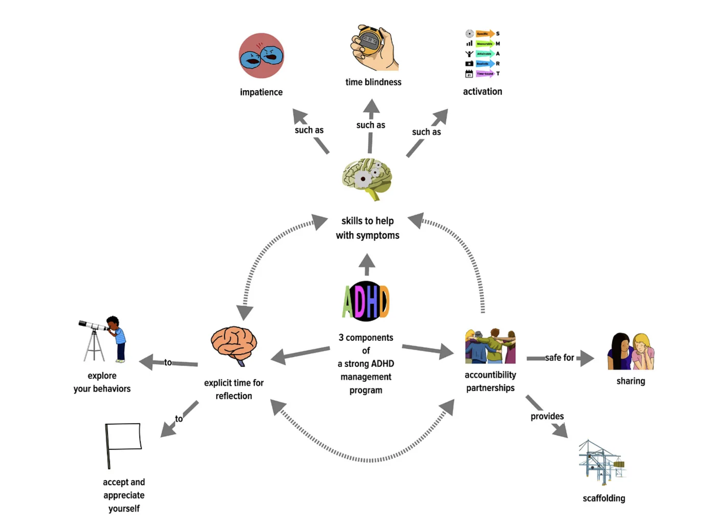 Successful ADHD coaching combines 3 key components: creating dedicated time to reflect, exposing yourself to new tools and skills, and holding yourself accountable through social partnerships.